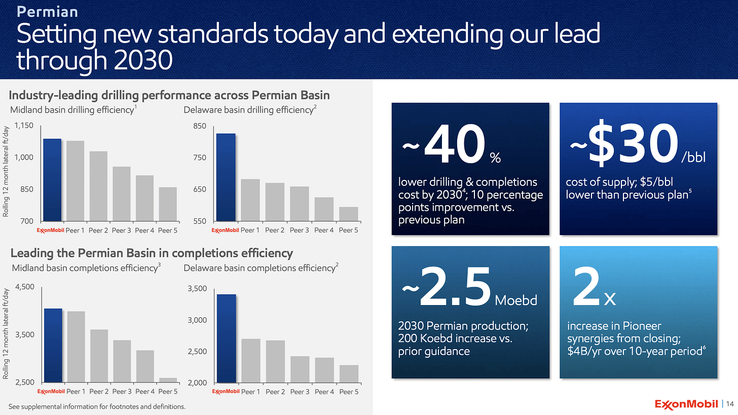 Part of the reason for the outperformance stems from Exxon. In Q3 2025, Exxon reported that Permian production averaged ~1.7 million boe/d. In its latest 2030 company guidance update, it noted that the Permian is expected to grow to ~2.5 million boe/d (+200k boe/d vs previous guidance).