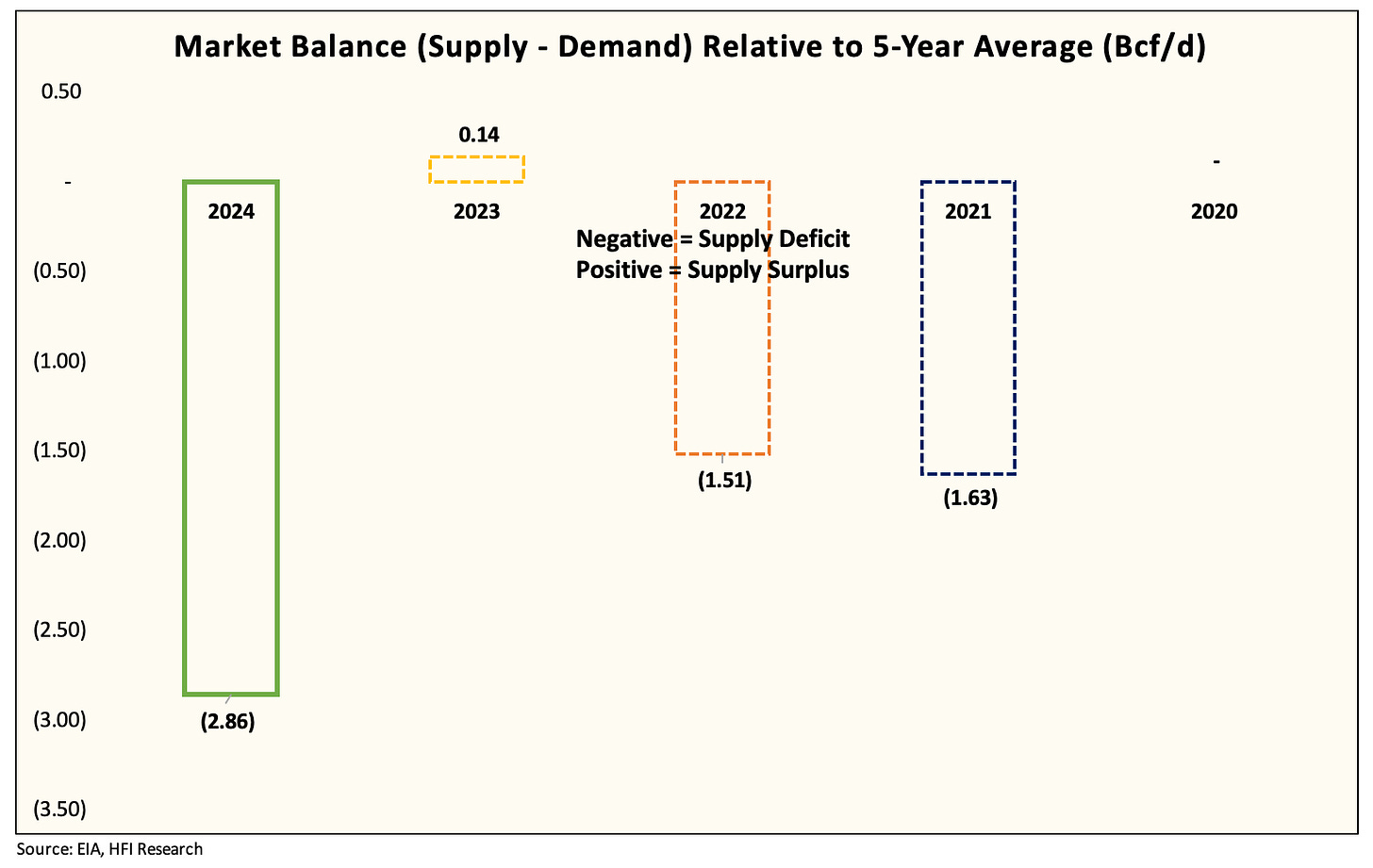 Looking at our implied balance going forward, we have the US gas market at a deficit of 2.86 Bcf/d. Assuming this production level holds into year-end (likely impossible outcome), natural gas storage would revert back to the 5-year average.