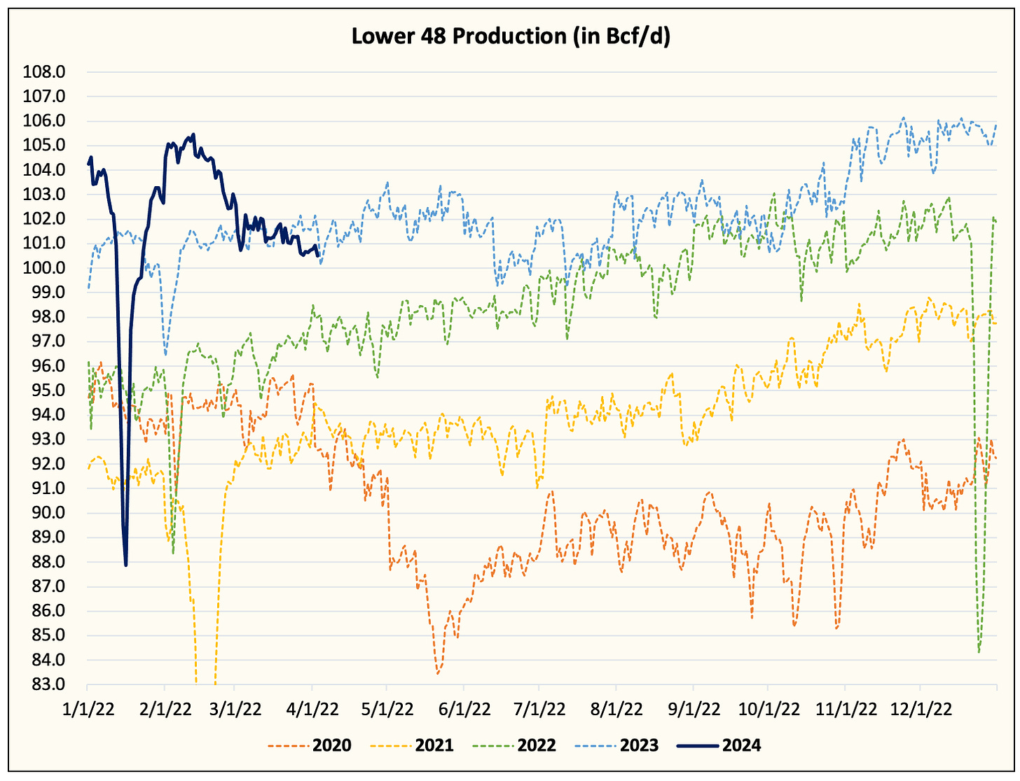 March saw Lower 48 gas production average just above ~101 Bcf/d with April early readings right around ~100.7 Bcf/d. As we said many times, the key to balancing the natural gas market this year is lower production, so long as production stays below ~102.5 Bcf/d, we have a tighter market.
