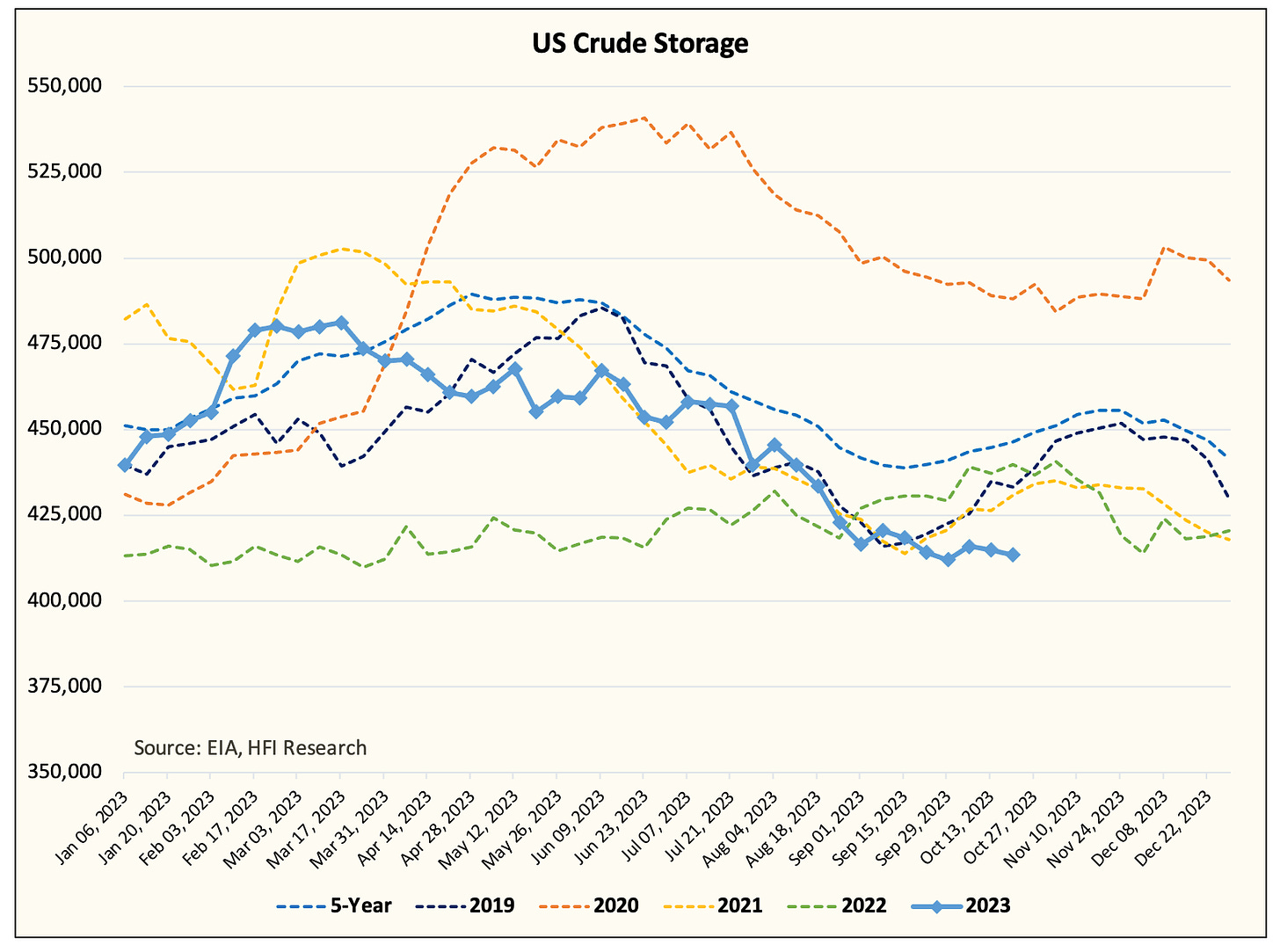 So for readers trying to stay ahead of the curve, please do not expect US commercial crude storage to fall well below ~400 million bbls. We are already tight and so the market will force relief one way or another.