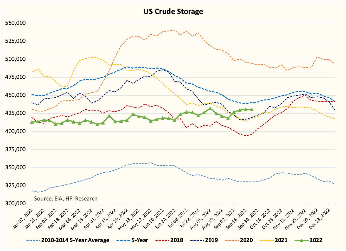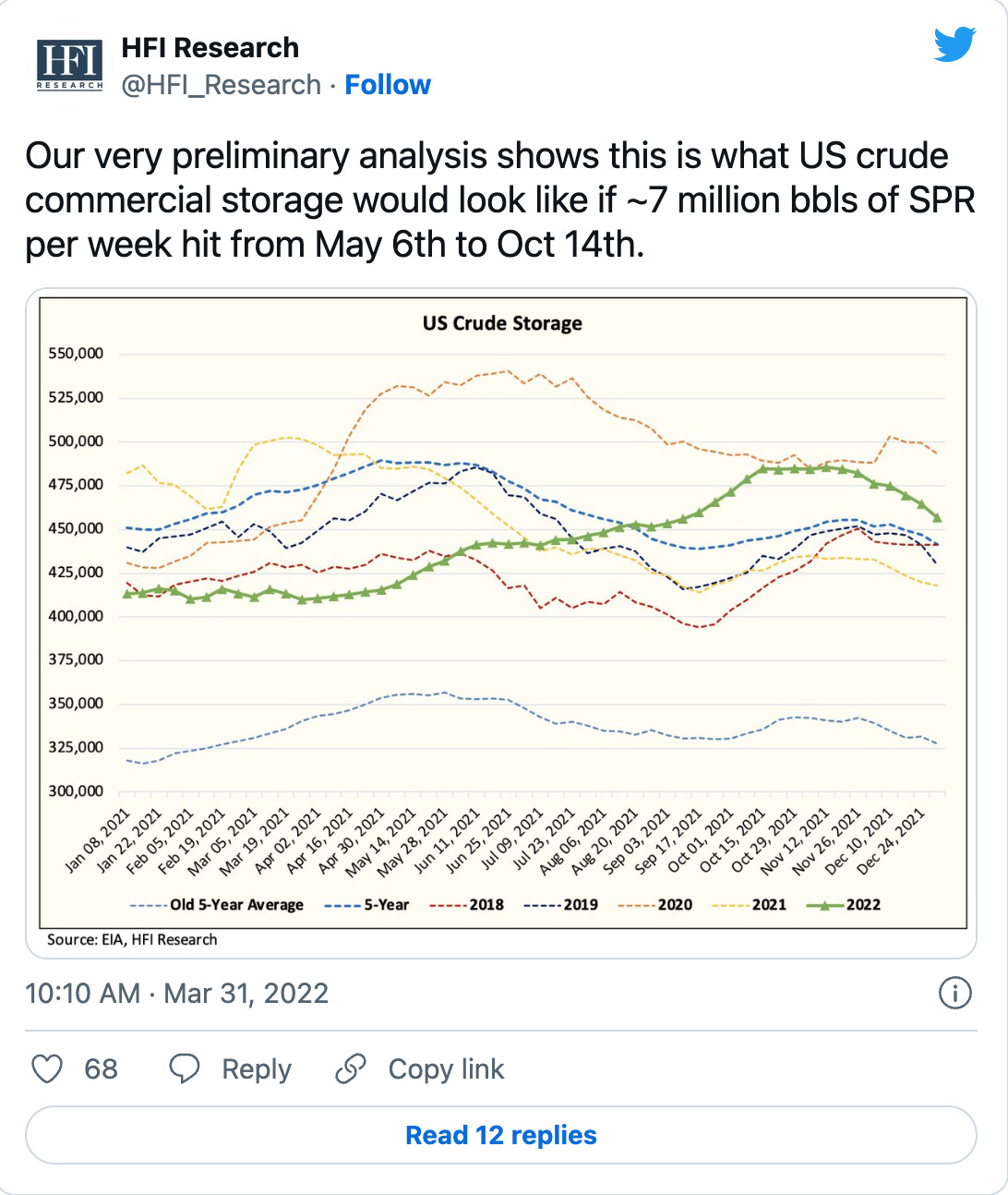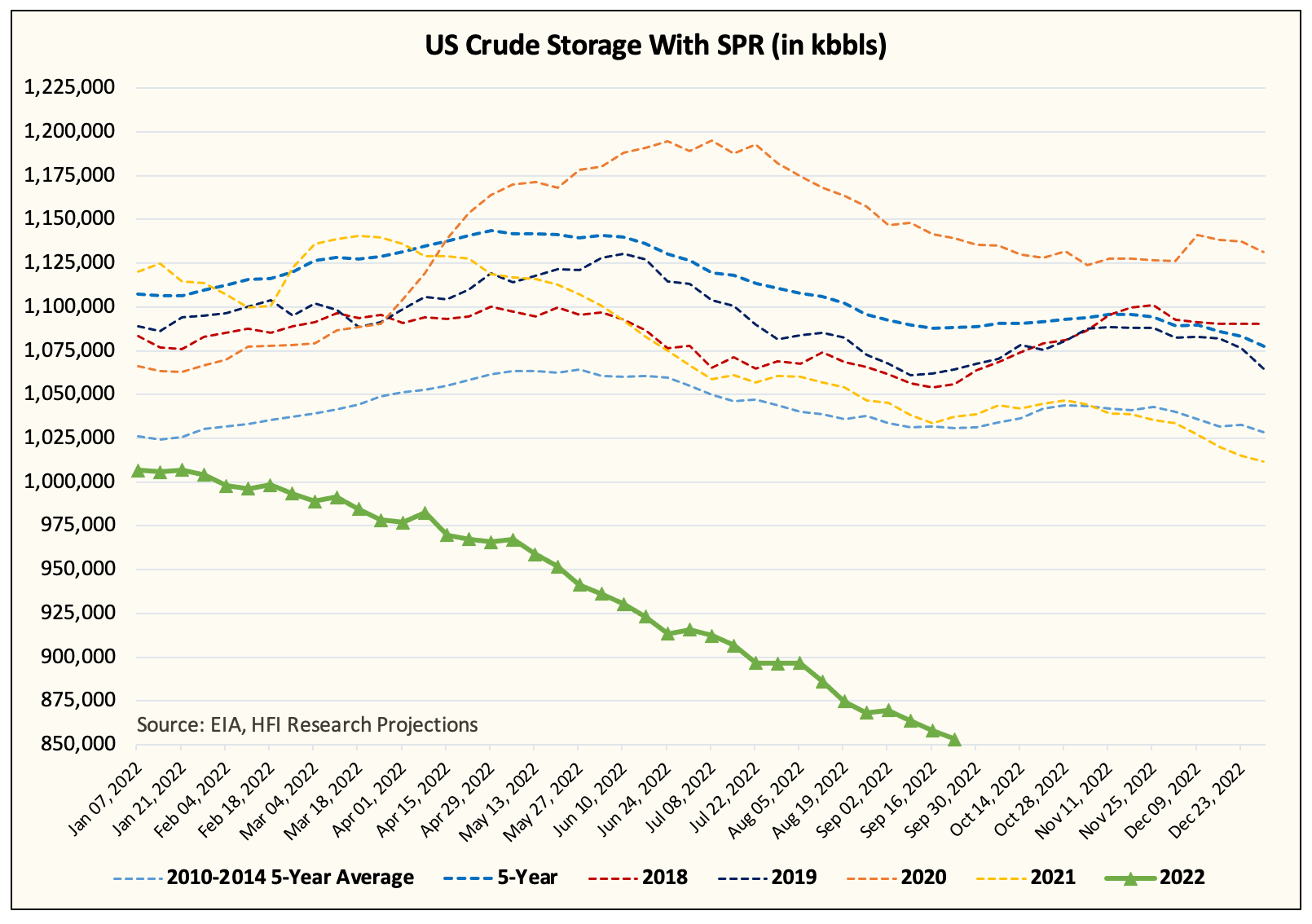 We have to first rewind it back to April. IEA just came out with the report predicting Russia will lose ~3 million b/d of production and a global coordinated SPR release effort was underway. At the time, the US was set to release ~1 million b/d or ~7 million bbls per week. Some of the oil bulls doubted that the Department of Energy was even capable of doing that citing pipeline constraints. We took a different view. SPR release was real and US commercial crude storage will build as a result.
