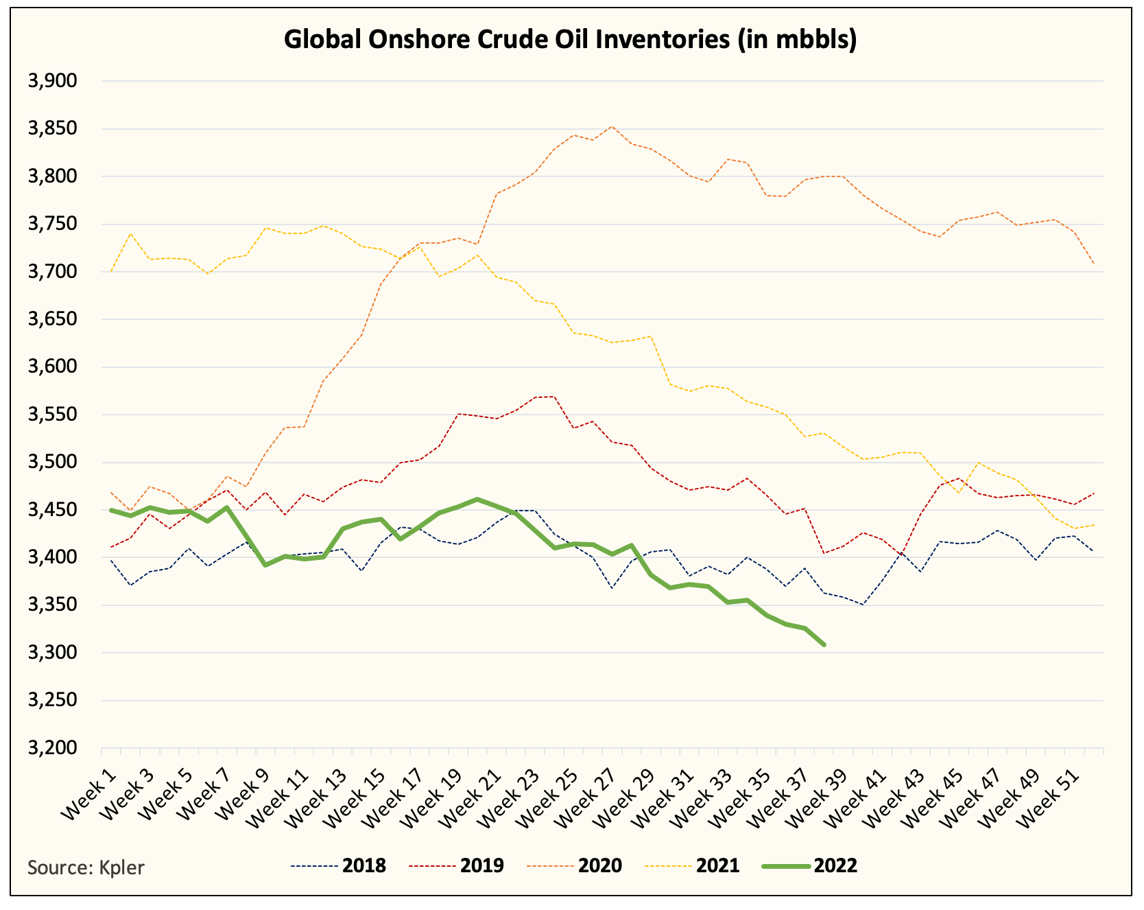 And despite the SPR release, lack of Russian crude production loss, and China's zero COVID policy, global onshore crude storage is still trending down. This really won't end well.