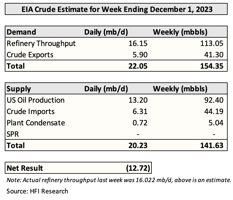 (Update) US Crude Storage Outlook - Big Draw HFI ResearchDec 05, 2023∙ Paid2ShareFor the week ending Dec 1, we have a crude draw of 12.72 million bbls. This post is for paid subscribersSubscribeAlready a paid subscriber? Sign inPreviousNext