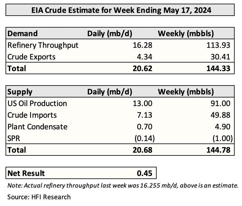 For the week ending May 17, we have a small crude build of 0.45 million bbls. This is relative to a -0.5 million bbl draw for the 5-year average.