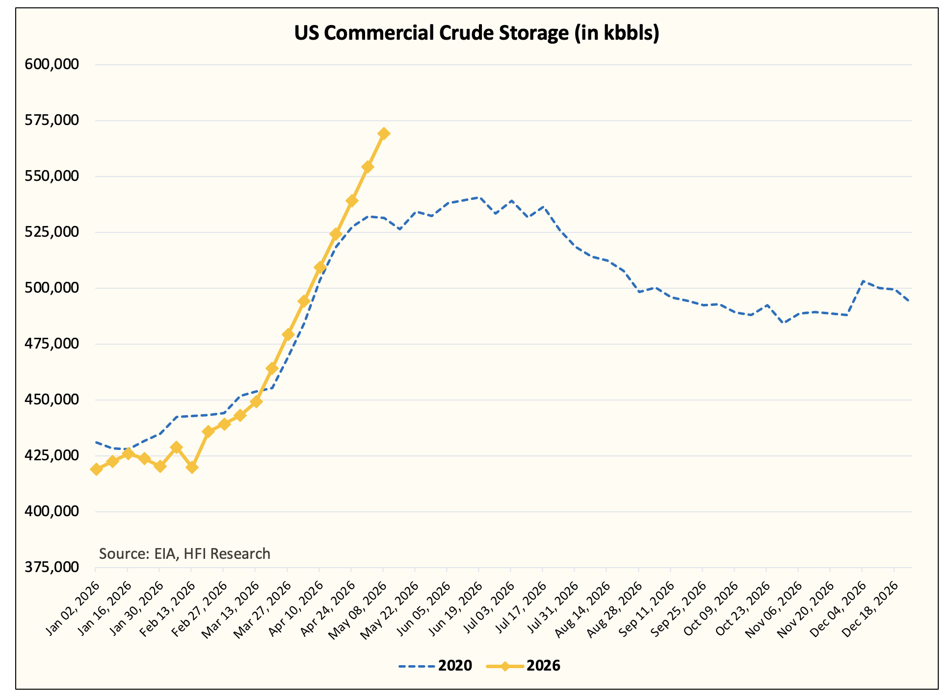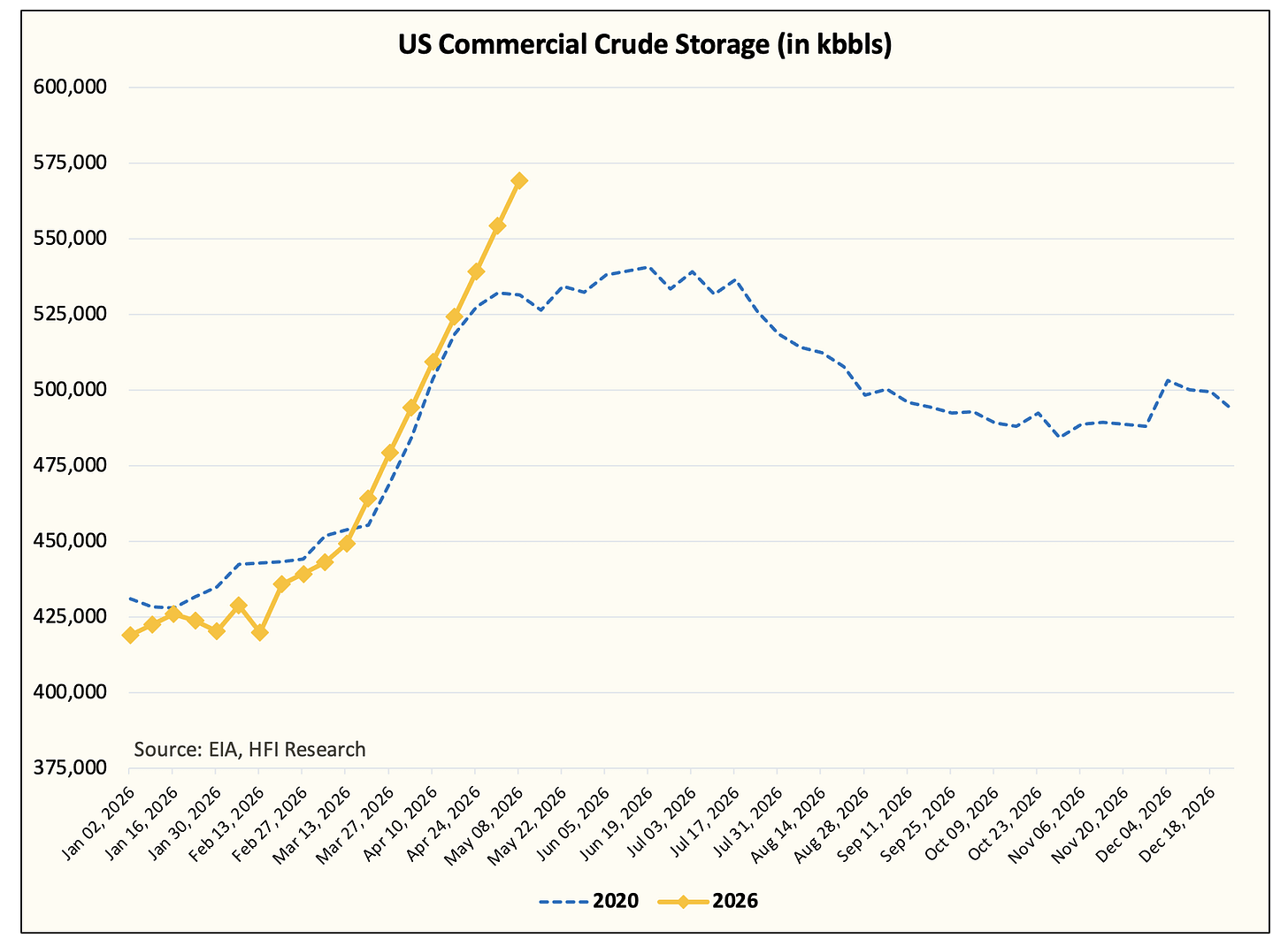 At the moment, US commercial crude storage is at 449 million bbls. In 2020, US commercial crude storage topped out at around ~540 million bbls. This coincided with Cushing reaching the tank top level of ~65 million bbls. The operational maximum capacity is between 540 to 570 million bbls.