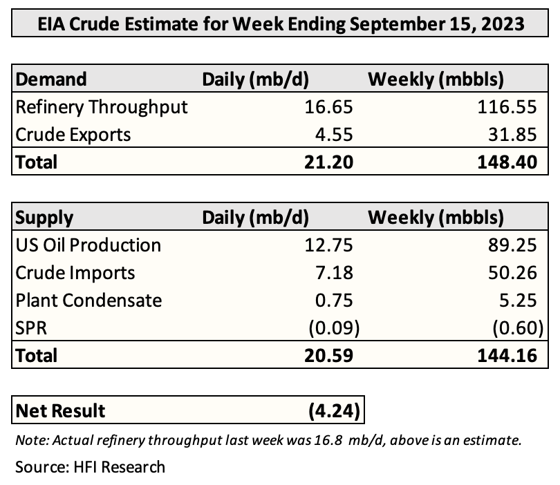 US Crude Storage Outlook - Crude Draw Returns But Focus Is On Product DemandHFI ResearchSep 19, 2023∙ Paid5ShareFor the week ending Sept 15, we have a crude draw of 4.24 million bbls. This includes the SPR build of 600k bbls.If the EIA reports something similar, this would push US commercial crude storage near a 5-year low.This post is for paid subscribersSubscribeAlready a paid subscriber? Sign inPreviousNext