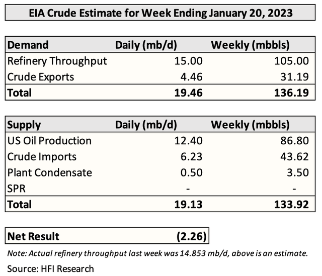 Following two weeks of back-to-back large crude builds, this week's estimate will be contingent on the fact that US refinery throughput improved to ~15 million b/d versus ~14.853 million b/d. US crude exports surged to ~4.46 million b/d this week.