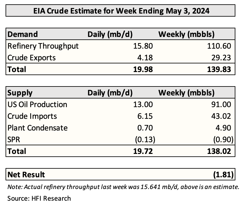 For the week ending May 3, we have a crude draw of 1.81 million bbls. Relative to the 5-year average build of +1.729 million bbls, a draw would be perceived bullishly.