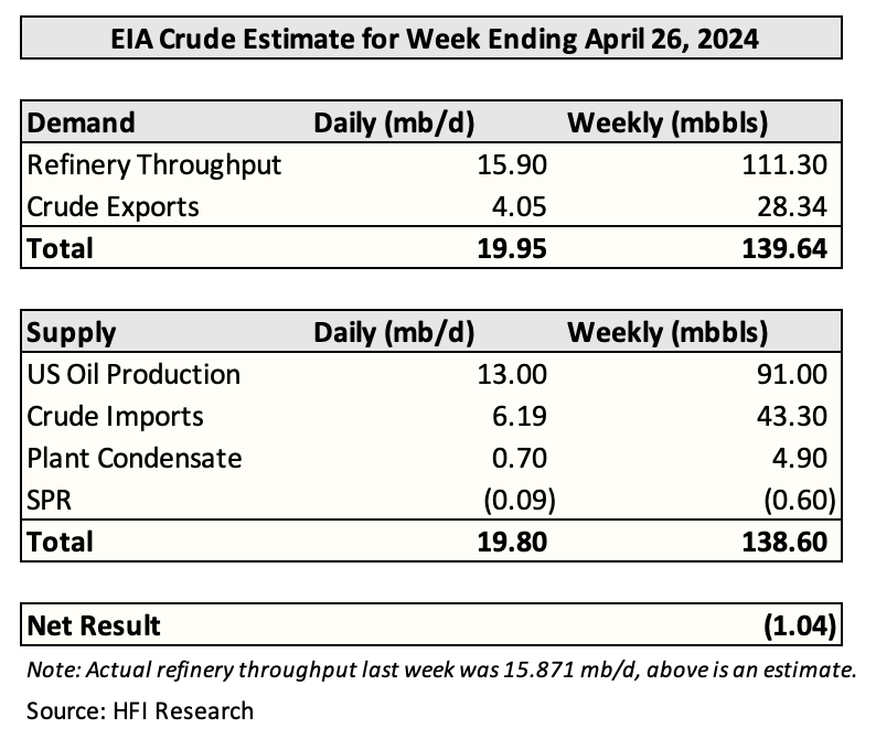 For the week ending April 26, we have a crude draw of -1.04 million bbls. This includes the SPR build of ~600k bbls.
