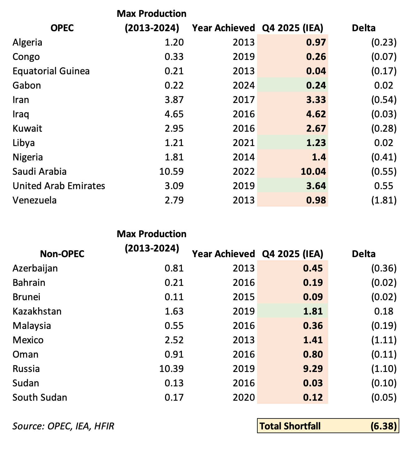 We then took the maximum yearly production achieved by each respective country in the table above and compared it to their Q4 2025 production estimates: