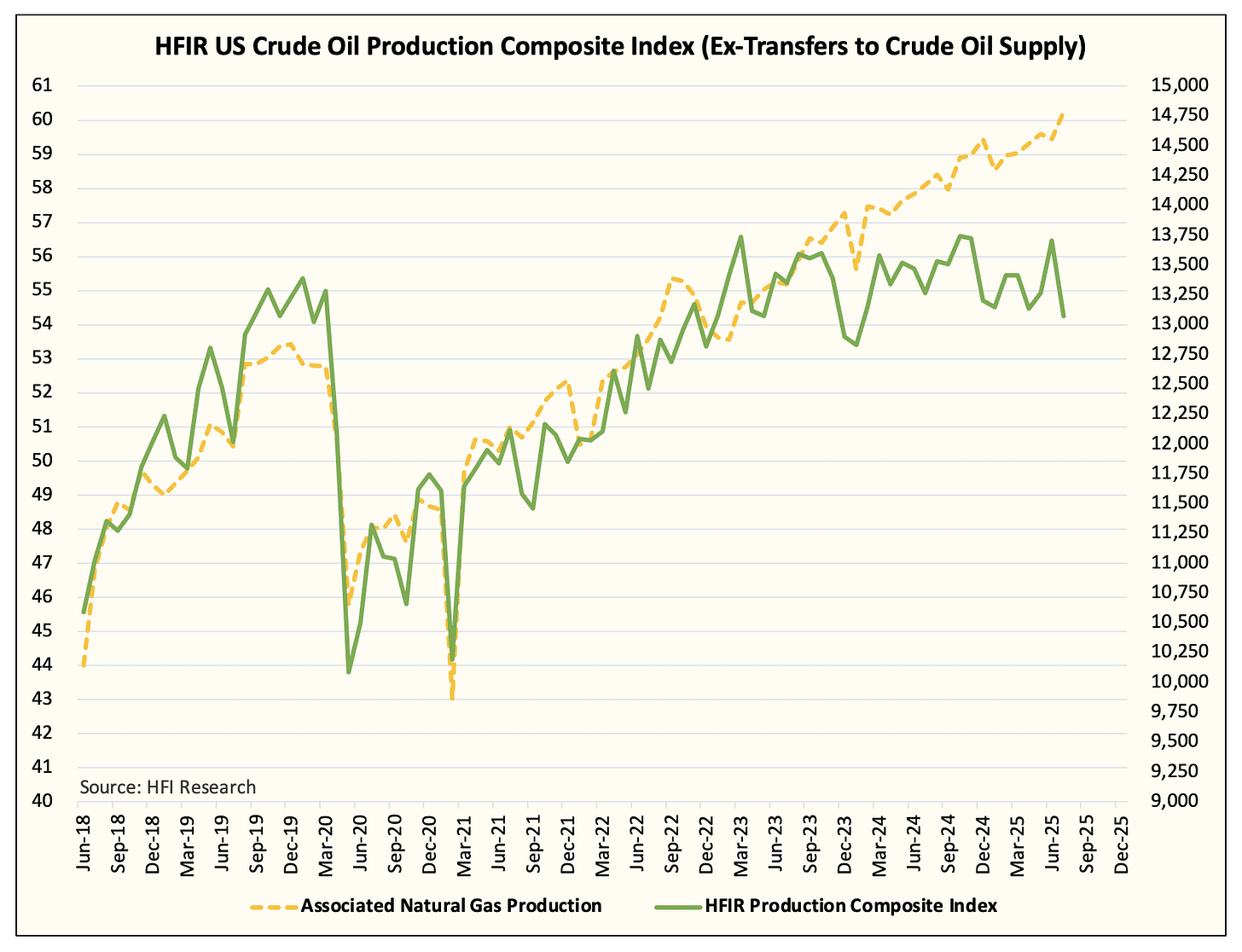 Associated natural gas production is starting to meaningfully outpace crude production growth. Gas-to-oil ratio is ballooning out of control in US shale oil basins.