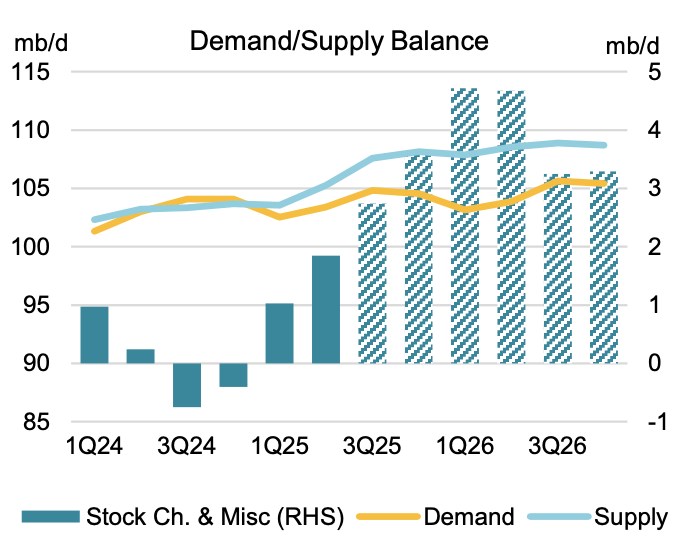 According to IEA’s latest supply & demand model, it estimates that 2026 oil market balances will show a surplus of ~4 million b/d.