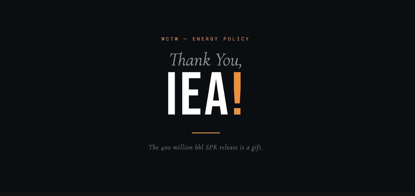 IEA just announced the largest ever strategic petroleum reserve (SPR) release in history: 400 million bbls.