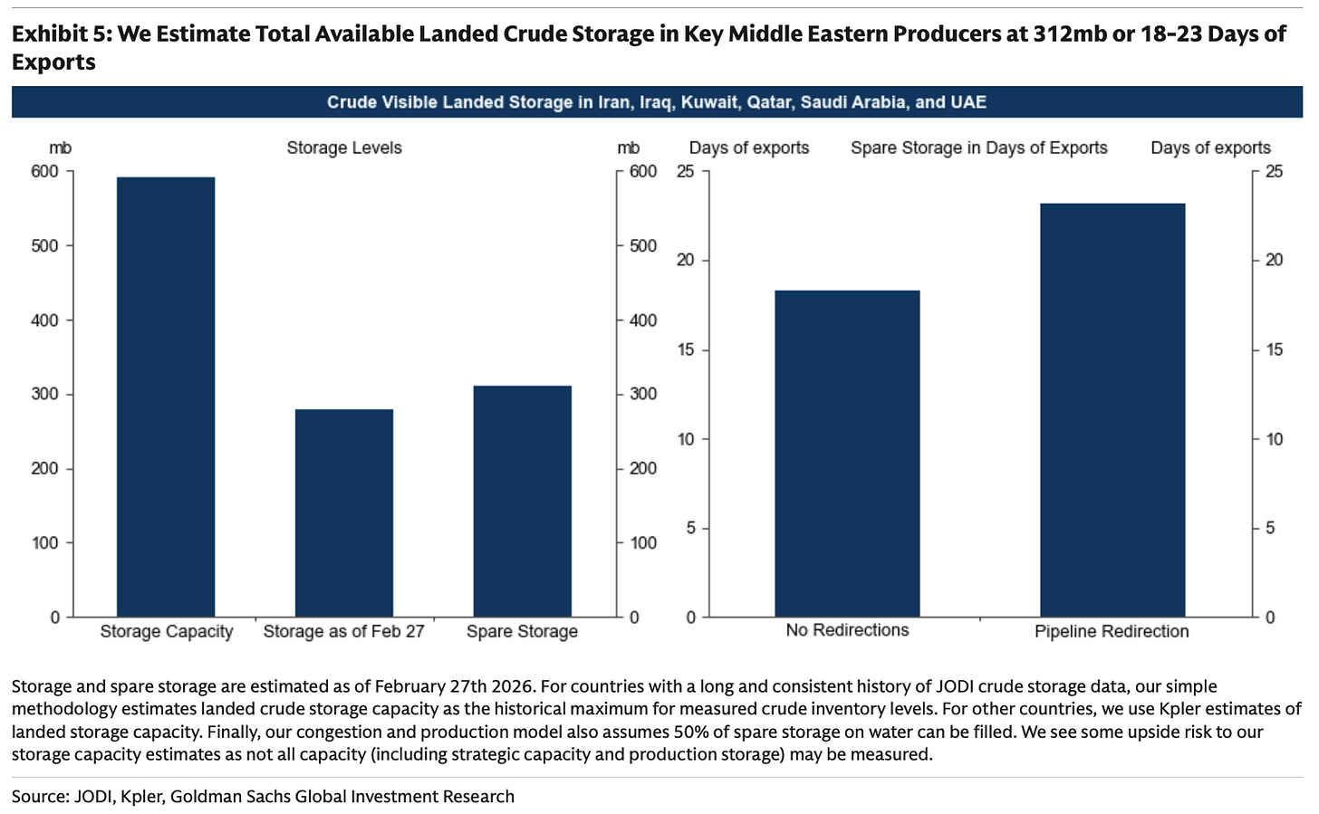 Goldman estimates that there are ~312 million bbls of capacity available. So we are still 2 weeks away from needing to shut in more production.