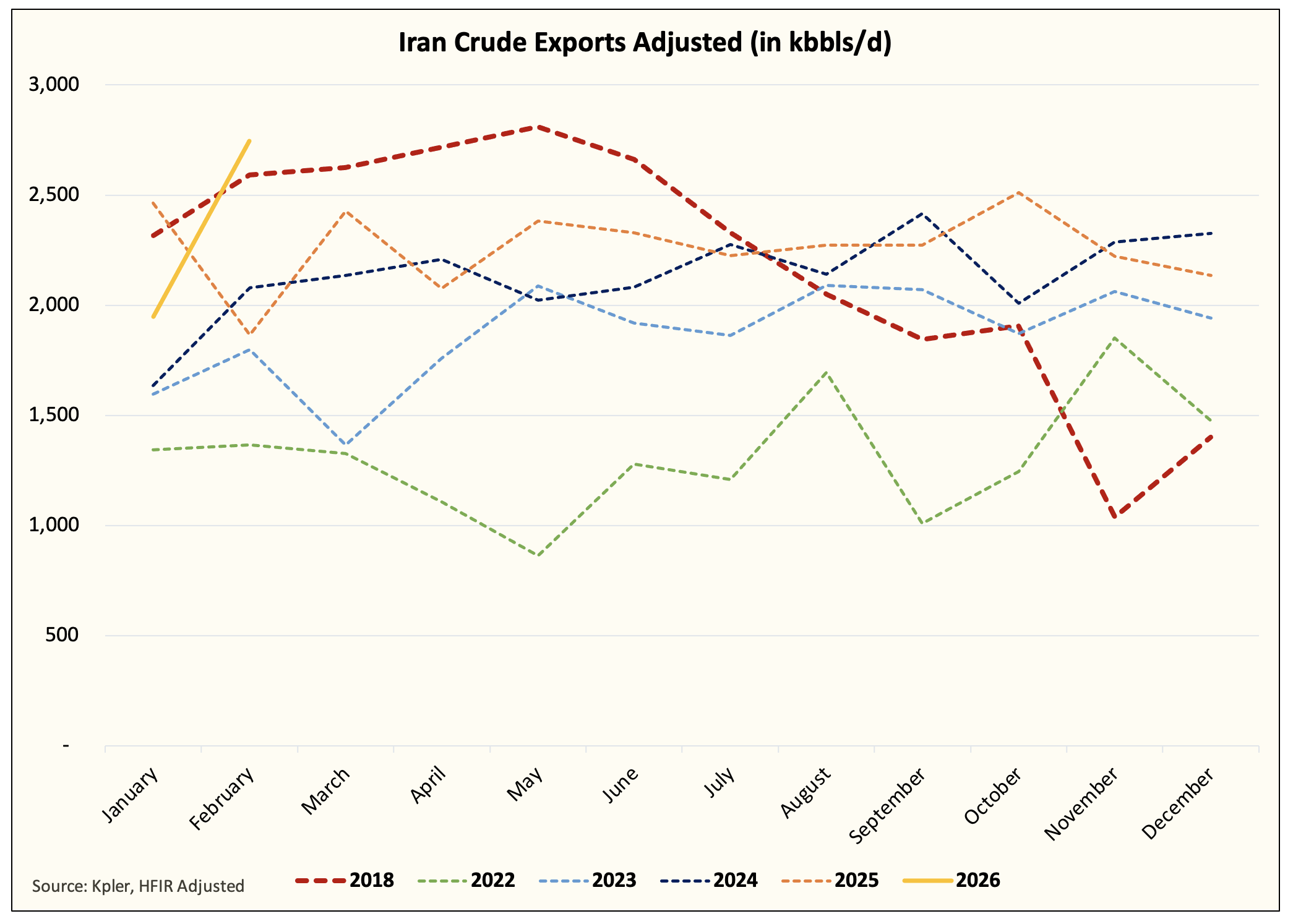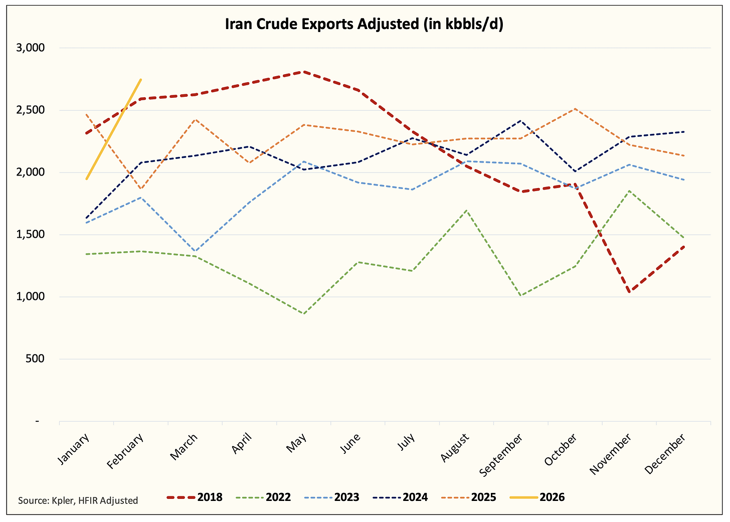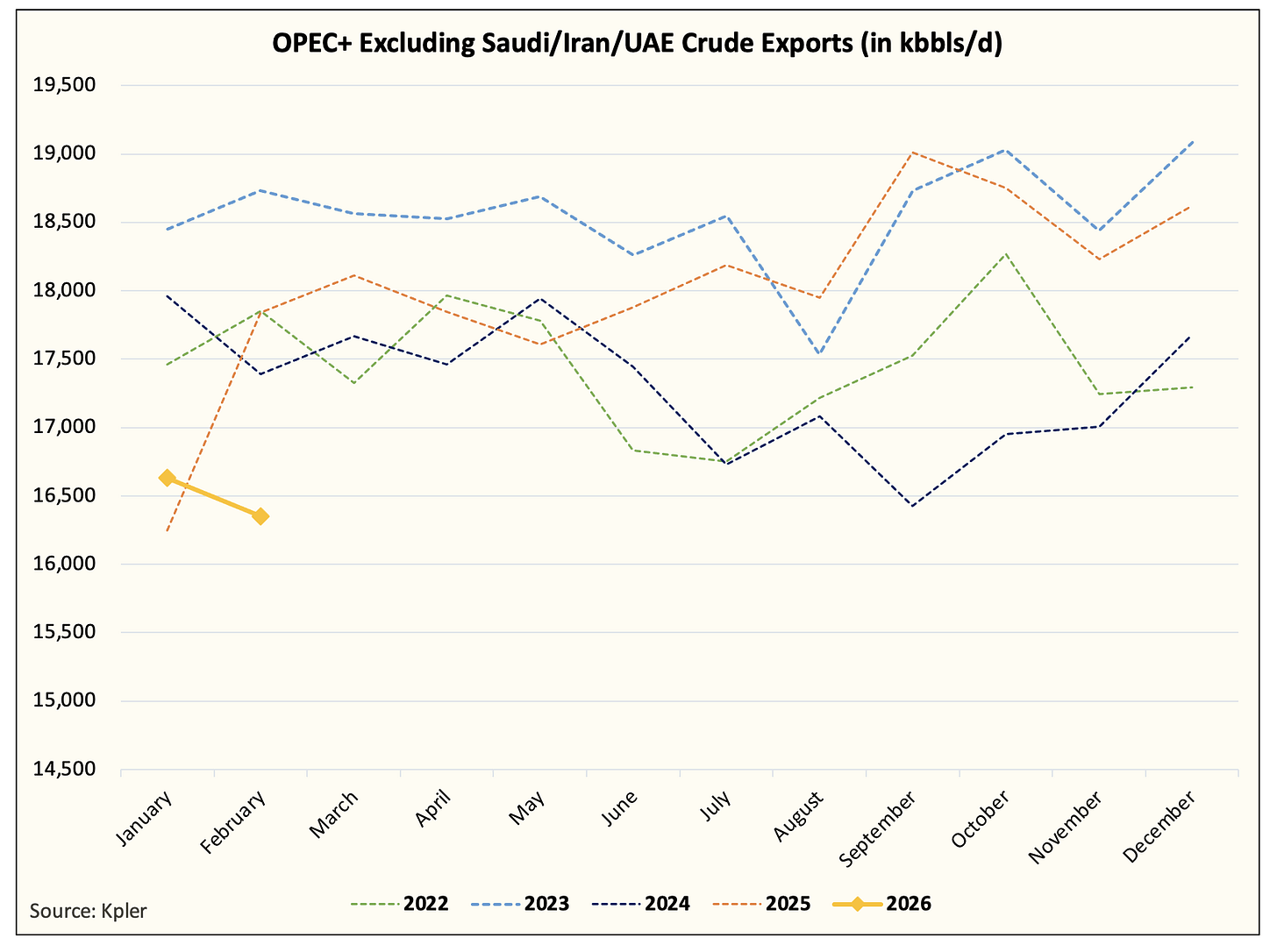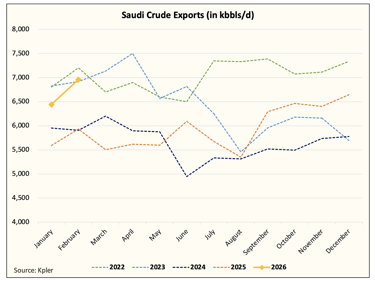 In this sense, February tanker tracking data provided by Kpler is showing an obvious peaking signal. Saudi, UAE, and Iran are exporting near max capacity. Saudis can export an additional ~500k b/d to average ~7.5 million b/d, but for both UAE and Iran, we are at the max.
