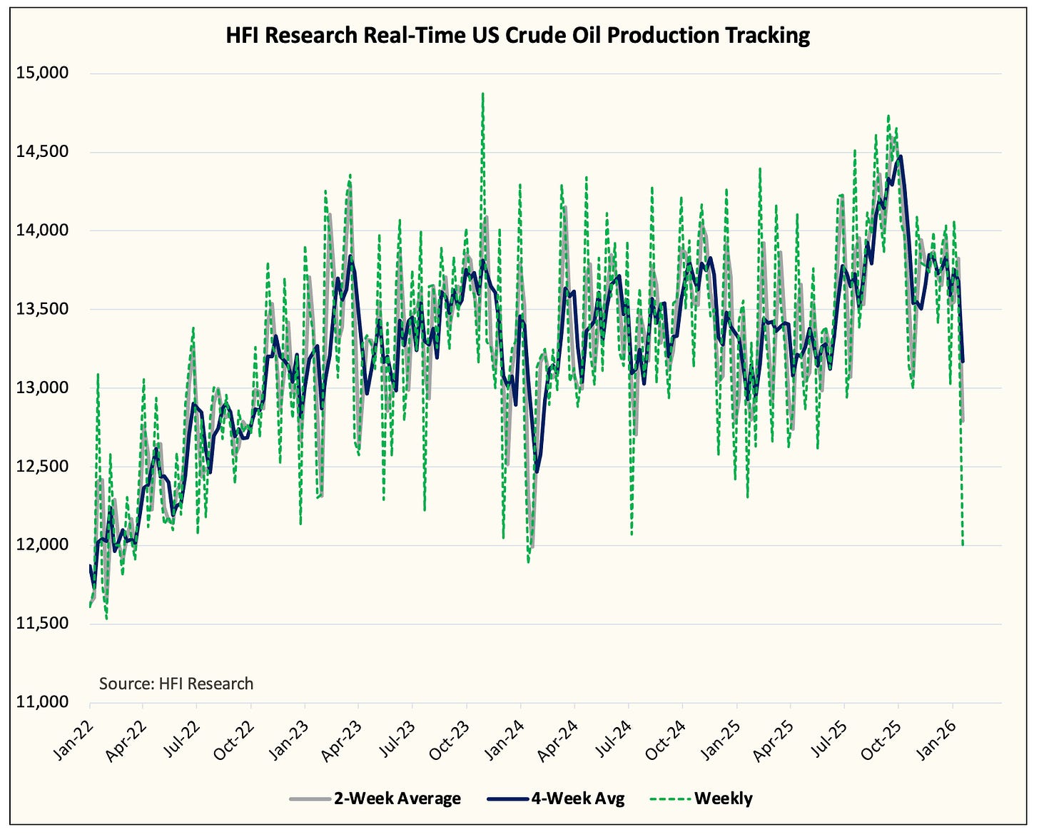 Our real-time US crude oil production showed a material drop due to the freeze-off.