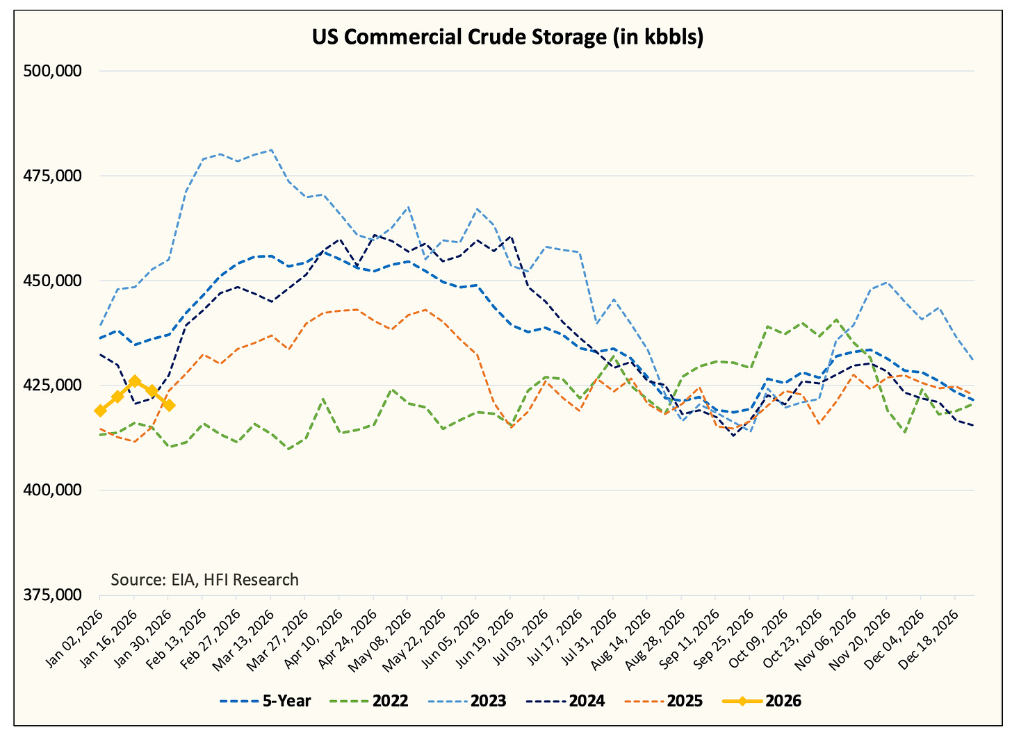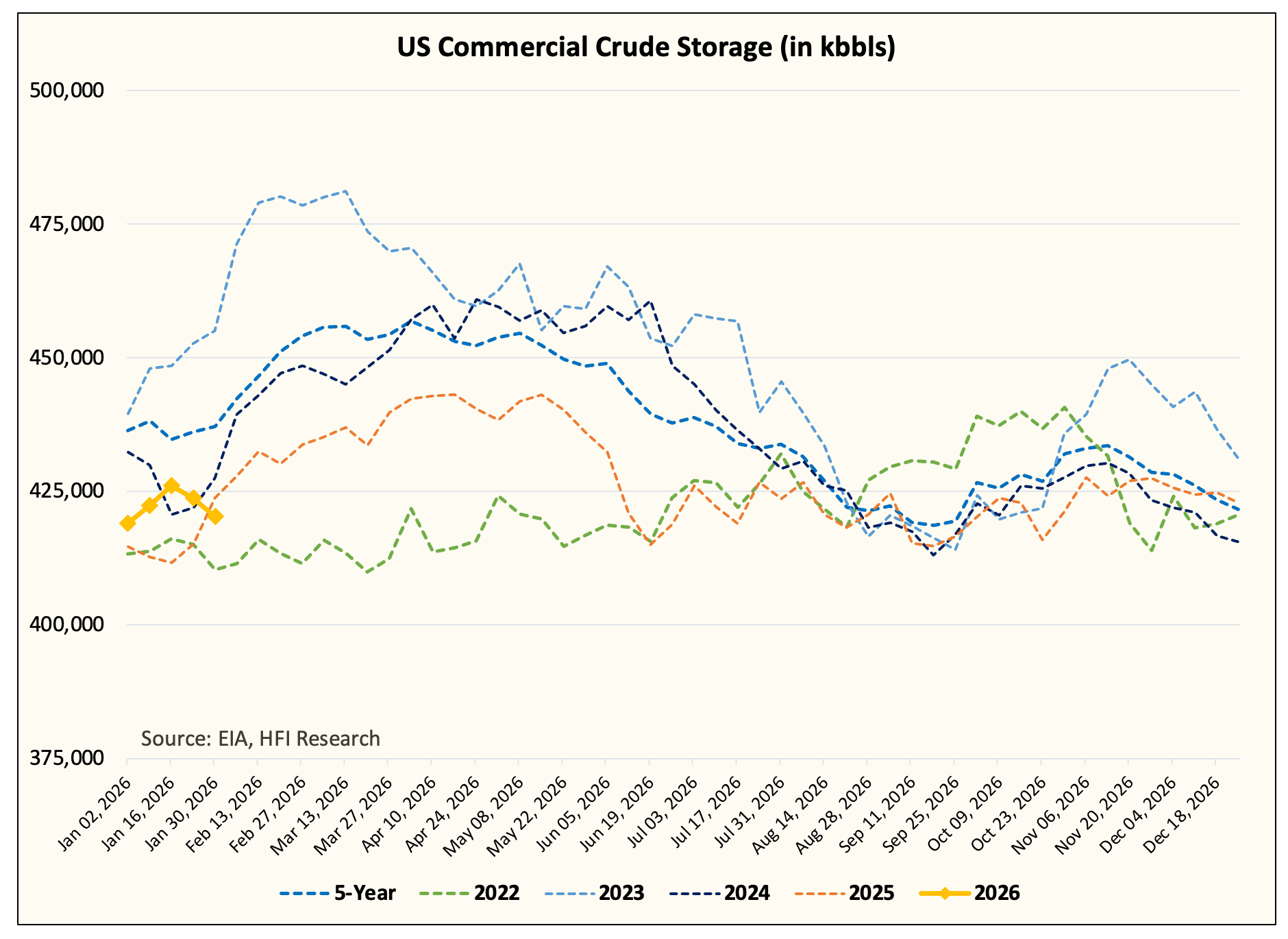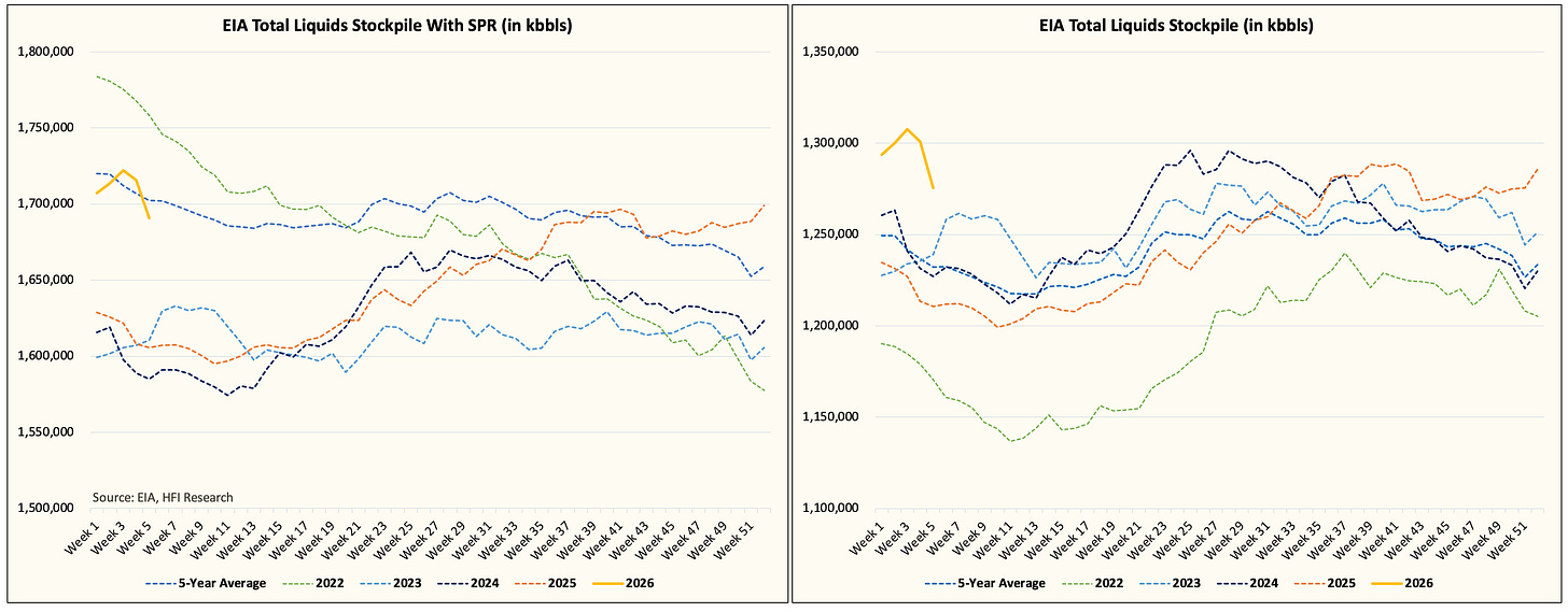 US total liquids stockpile is now down YTD. For next week’s EIA oil storage report, total liquids will show another draw as colder-than-normal weather persisted to Feb 2.