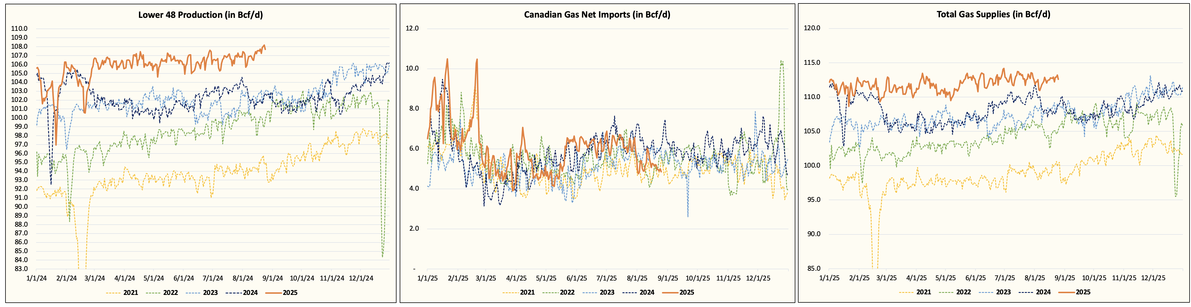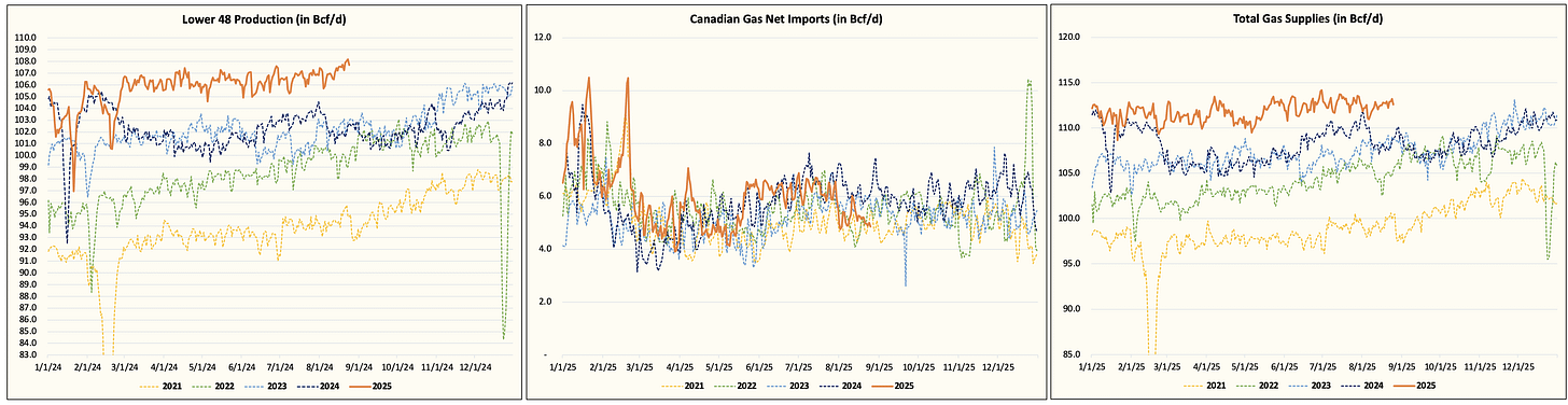 But what you will notice is that total demand remains above last year, thanks largely to the structural demand increases (LNG + Mexico). Total gas supplies are also higher year-over-year as production was impacted by low prices last year.
