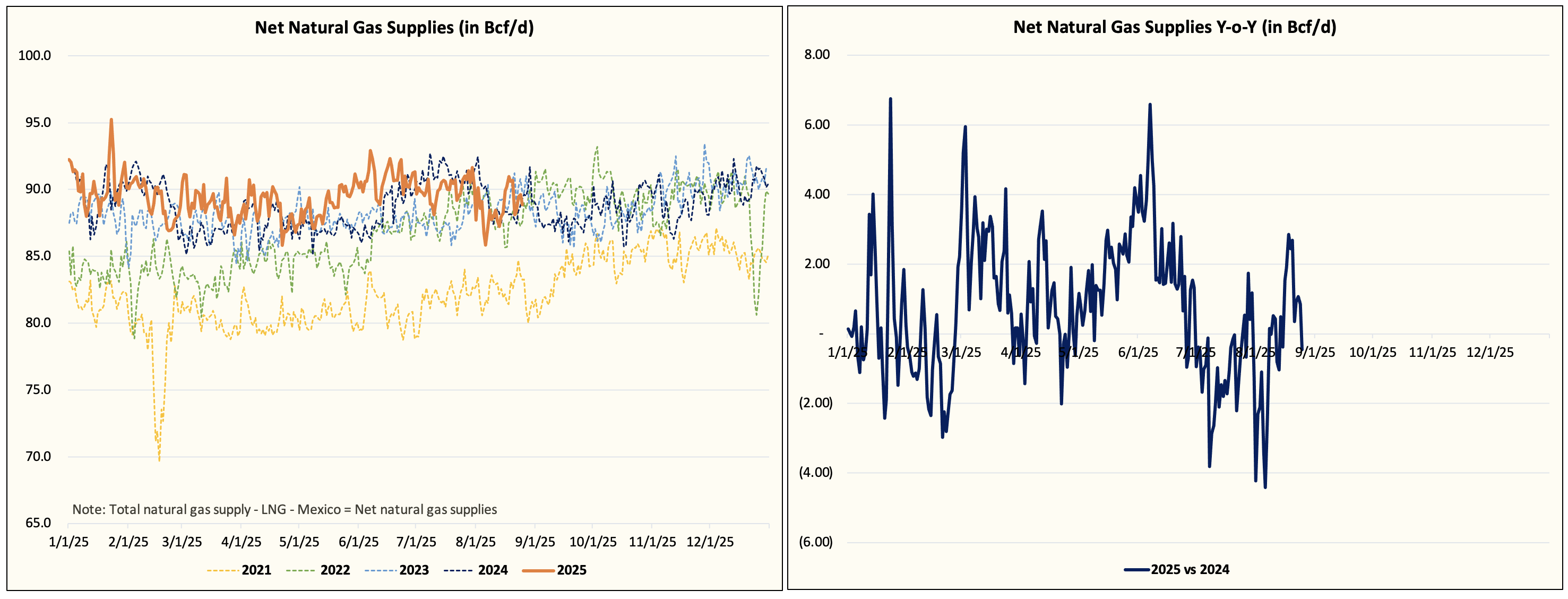 In aggregate, net gas supplies remain only slightly above last year (on average). As a result, the majority of the surplus we are seeing in gas storage is primarily due to lower power burn demand from the weather.