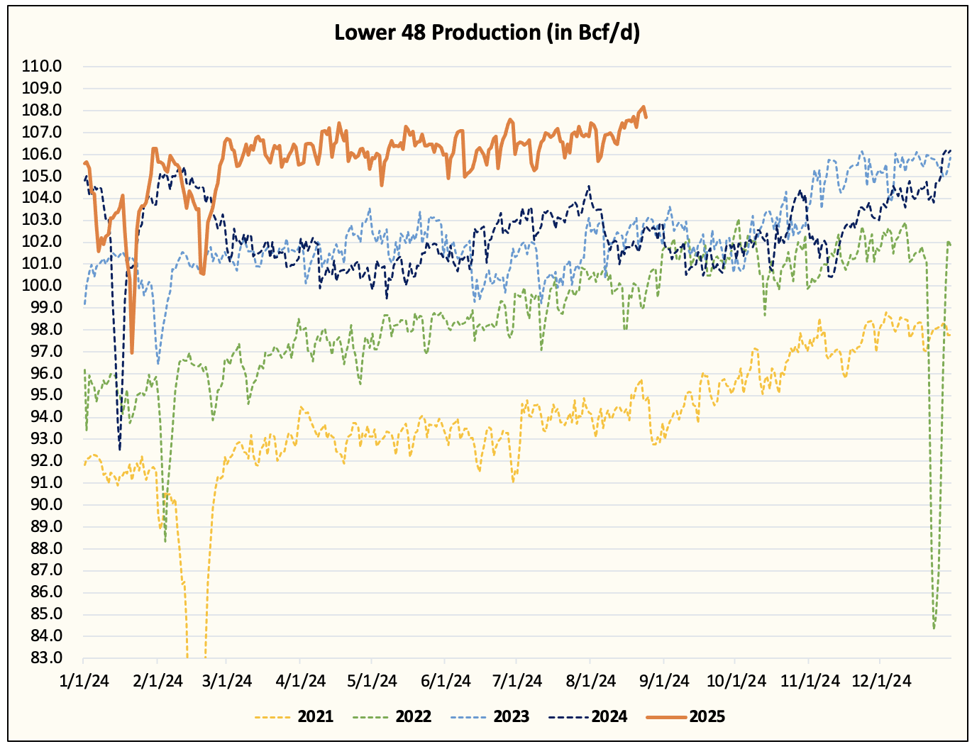 Lower 48 gas production will have to increase to ~111 Bcf/d to match that.