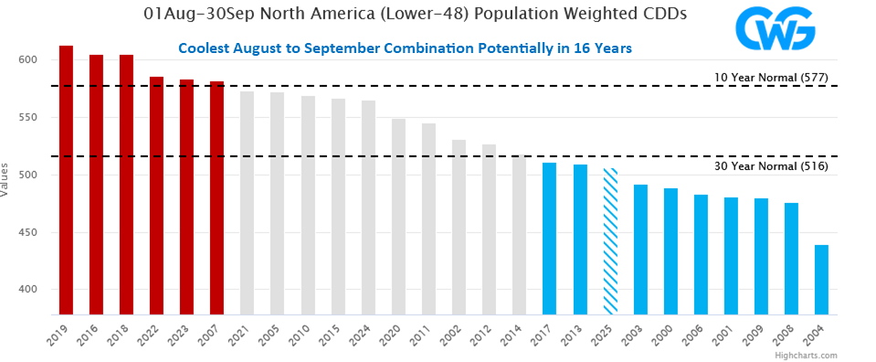 The August weather setup is not normal. The weather this month is expected to be so bearish that it will be the lowest cooling demand since 2017.