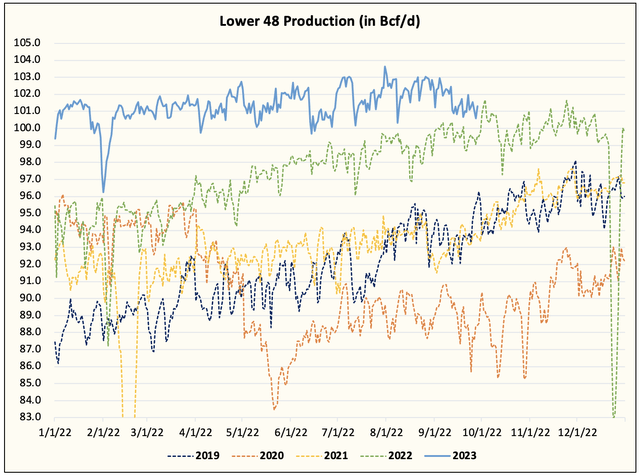 After reaching a high in early August above ~103 Bcf/d, Lower 48 gas production has not been the same since. The September average is closer to ~101 Bcf/d. Going into year-end, we do expect production to trend back higher to average around ~102 Bcf/d, but this is below the ~103.5 Bcf/d we had expected.